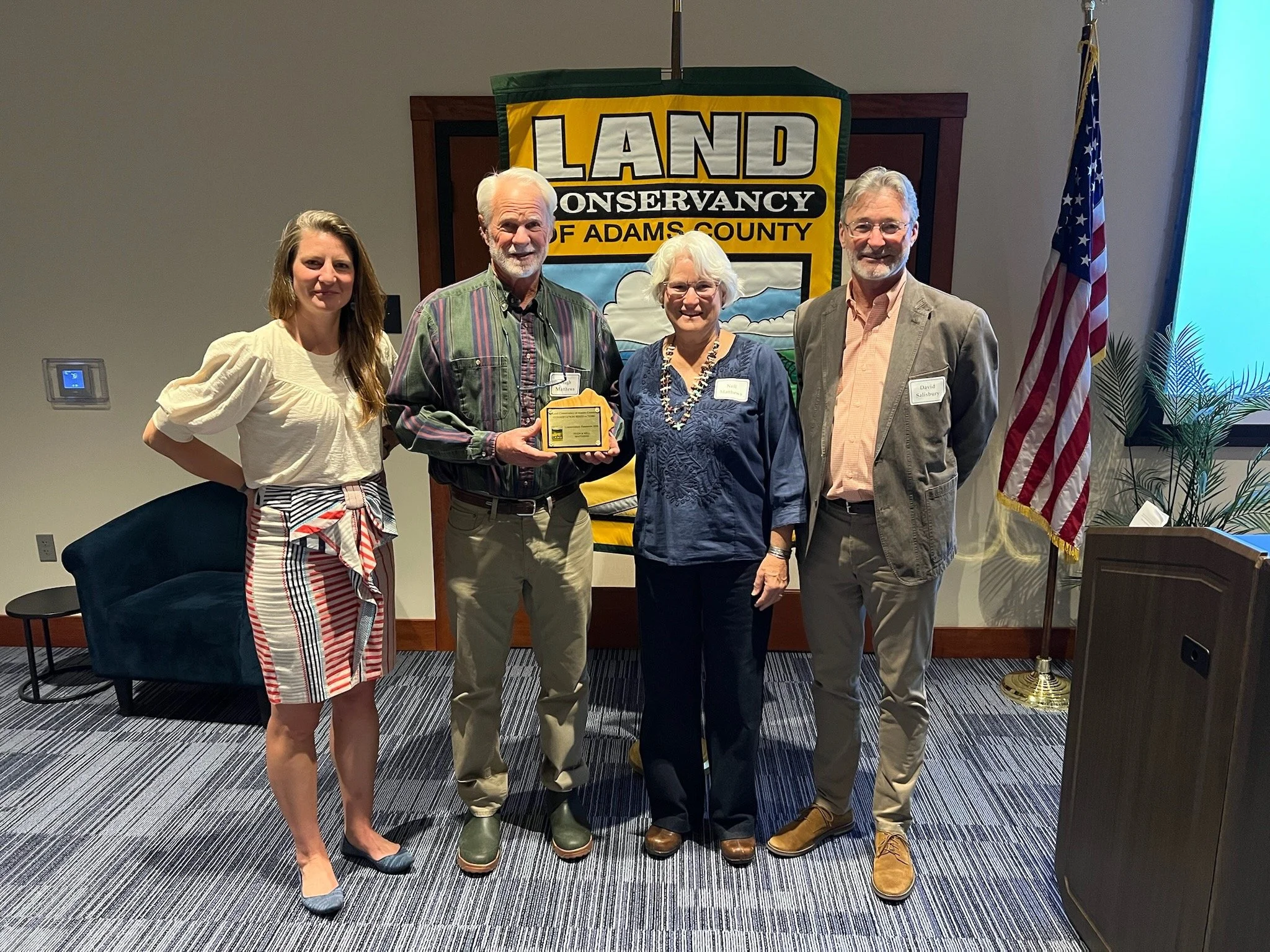 During its 2025 annual dinner, the Land Conservancy of Adams County honored four landowners who recently preserved Adams County farmland, woodland, open spaces, and freshwater streams. These landowners were Hugh and Nell Matthews, who preserved 37.7 acres in Freedom Township; Sara and Jamey Tatman, who preserved 83.4 acres in Cumberland Township; 4J Farm, which preserved 133.9 acres in Huntington and Tyrone Townships; and Boyer Nurseries and Orchards, which preserved 159 acres in Franklin Township. With this landmark easement, Boyer Nurseries and Orchards has become the first conservation benefactor to preserve over 1,000 acres with the Land Conservancy!